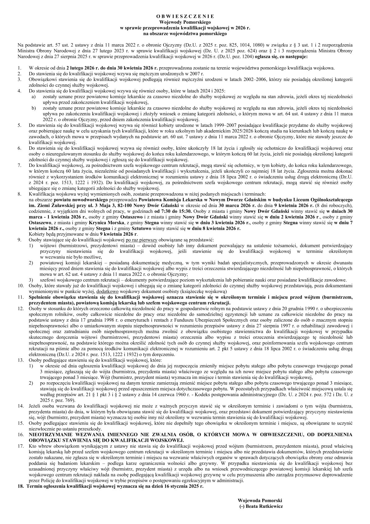 obejmując osoby urodzone w 2007 r. oraz starsze, podlegające obowiązkowi. Szczegółowe wezwania imienne, zawierające terminy i miejsca stawienia, będą doręczane przez urzędy gmin (miast) w poszczególnych powiatach województwa pomorskiego. Informacje o ogłoszeniu są dostępne
